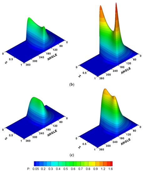 Three-dimensional dimensionless pressure distributions when (left) and (right). (a) Ideal case, (b) 3D misalignment ( and (c) 3D misalignment () and curved modification .