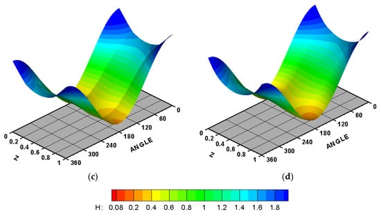 Three-dimensional dimensionless film thickness when . (a) Ideal case, (b) 3D misalignment (, (c) 3D misalignment () and linear modification and (d) 3D misalignment () and curved modification .