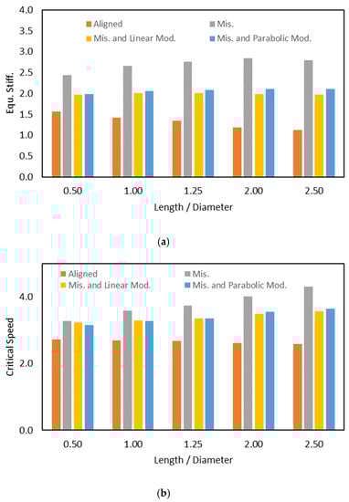 Three-dimensional misalignment effect for a wide range of Length/Diameter ratio on the (a) Dimensionless equivalent stiffness coefficient and (b) dimensionless critical speed; .