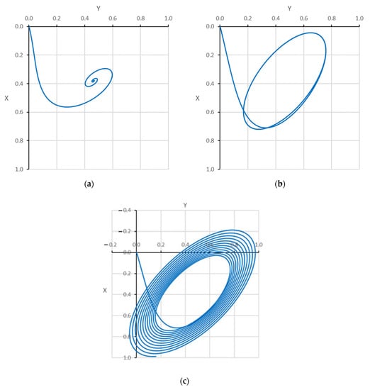 The journal center trajectories for the unmodified system, due to position perturbation when at (a) half the critical speed, (b) critical speed, and (c) greater than .