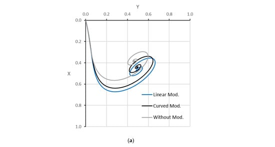 The journal trajectory during the operation explains the system’s dynamic response to any form of excitation. The operation speed is one of the most vital factors in determining the amplitude of the dynamic response. The journal trajectories will be explained first for the unmodified bearing. Then, the corresponding trajectories of the modified bearing will be explained later for the two forms of modification. Figure 15 illustrates the journal center trajectories for the unmodified system due to position perturbation when at three different operational speeds, which are half the critical speed, critical speed, and higher than . Figure 15a shows the journal trajectory at an operating speed of 1.347 (3290 rpm), which is . The journal center returns to the steady state position (equilibrium) after a certain period of time, representing the system’s stable condition. Figure 15b shows the corresponding path at an operating speed of 2.694 (6580 rpm), which is of the system. It is clear that the journal continues to rotate around the equilibrium position, which represents the critical response of the system where any increase in the operating speed will produce higher amplitude, and the system moves to unstable conditions. Figure 15c illustrates the journal trajectory at an operating speed of 6800 rpm, which is just of the system. The amplitude of the trajectory starts to build up until the shaft’s touches the bush surface. This extremely dangerous situation results from operation under unstable cases, which must be avoided under any circumstances. Extending the range of the operating speed in which the system operates under stable conditions represents a significant enhancement in the design of the considered system, as the operation under severe conditions for a long period of time will certainly impact the designed values of the dynamic characteristics. Modifying the bearing profile helps in this direction in addition to the main improvements in the values of Ho and Po, as explained previously.