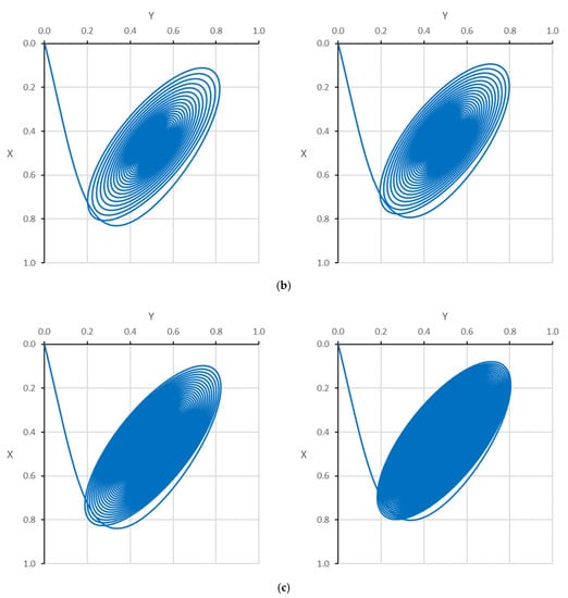 The journal center trajectories due to position perturbation when (a) Modified and unmodified bearings at of unmodified bearing, (b) linear (left) and curved (right) modification at of unmodified bearing, and (c) linear (left) and curved (right) modification at greater than of unmodified bearing.