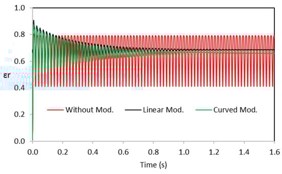 Figure 16 shows the dynamic response to shaft perturbation when for the modified bush under different operating speeds. Figure 16a compares the trajectories when the rotational speed is half for the two modification forms in addition to the unmodified bearing. The trajectory of the unmodified system illustrated previously in Figure 15a is repeated here for the purpose of comparison. It can be seen that the journal trajectories of both modified bearings are returned to the equilibrium position with slightly different paths. The curved modification produces a path closer to the unmodified bearing. Figure 16b shows the shaft trajectories of the modified bearings when the operating speed is equal to of the unmodified bearing (see Figure 15b for the journal trajectory of the unmodified bearing at critical speed). This figure illustrates that the journal centers return to the steady-state position for both forms of modification in contrast with the continuous rotation around the equilibrium position in the unmodified case. The journal of the modified bearing can operate safely at a speed greater than of the unmodified design, as shown in Figure 16c, where the operating speed is 6800 rpm. In this case, the journal center also returns to the steady state position compared with the growing journal amplitude of the unmodified bearing at this speed. Further comparison of the eccentricity ratio variation with time for the unmodified and modified bearings is shown in Figure 17. The operating speed for the results shown in this figure is of the unmodified bearing. The eccentricity ratio in the case of unmodified bearing (shown in red) fluctuates continuously around 0.6 (the steady state value) at this speed, while the corresponding eccentricity ratios in both forms of modification reach a steady state value after a period of time. The curved modification produces an eccentricity ratio (shown in green) closer to the steady state value of 0.6. It is worth mentioning that similar behaviors are obtained for the other ratios, which shows a sense of generality in the results.