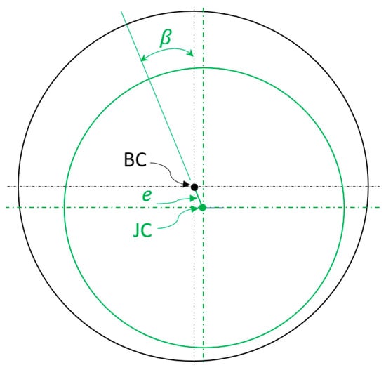 Figure 1 illustrates an exaggerated scale for a side view of a typical journal bearing in perfectly aligned cases, where the cross-section at any position along the bearing length is the same. In this rarely encountered case in industrial uses of this type of bearing, there is no deviation between the shaft and bearing longitudinal axes. The ideal parallelism between these axes results in the gap given by Equation (1) between the inner surface of the bearing and the journal surface. This equation is used together with the well-known Reynolds Equation (2) to solve the hydrodynamic lubrication problems in this type of bearings [5,39].
