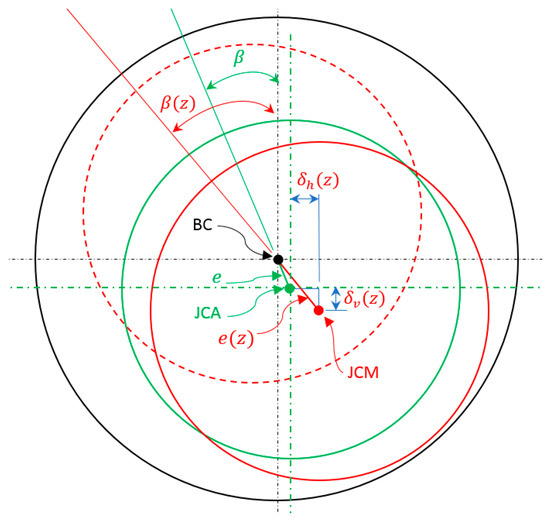 An exaggerated scale of the adopted general misalignment model. Circle in solid red: front side of the misaligned journal, circle in dashed red: rear side of the misaligned journal, and circle in green: journal in its perfectly aligned case. (BC: bearing center, JCA: journal center for the aligned case, and JCM: journal center (front side) for the misaligned case).
