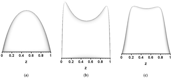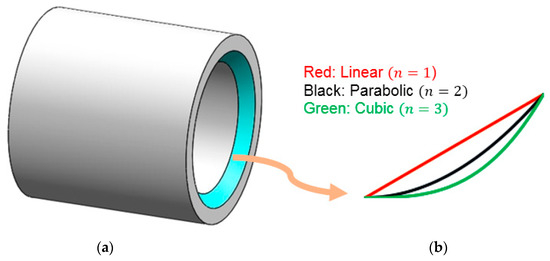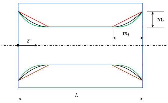 Figure 4 shows a longitudinal section of the bearing, with an exaggerated scale of the resulting bearing edges due to the suggested modifications. The three types of profiles are shown together for illustrative purposes. The modification parameters are shown in this figure, which are and , representing the modification’s value at the bearing edge in the radial direction and the length of the modified portion from the bearing length on both sides, respectively.