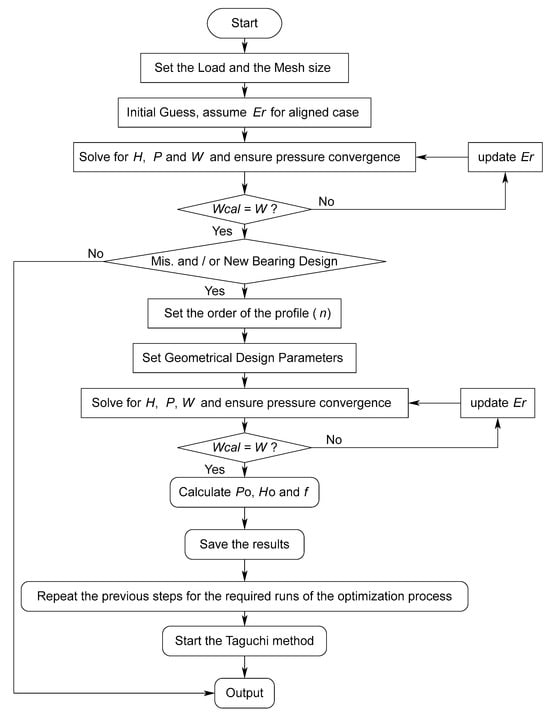where and represent the number of nodes in the circumzenithal and longitudinal directions, respectively. Once the solution converges in terms of the pressure distribution, the load is determined by integrating the pressure field numerically. The resulting load from this integration must be within an accuracy limit of in comparison to the real supported load. Otherwise, is changed, and all the previous steps are repeated again in order to obtain a new pressure field. This process continues until both convergence criteria are satisfied. Then, the optimization process is started using the Taguchi method to identify the optimal bearing profile in terms of the profile order (), and the profile parameters and . Figure 5 illustrates these solution steps. It is worth mentioning that the load in all cases corresponds to the load of the aligned case when the eccentricity ratio is 0.6.