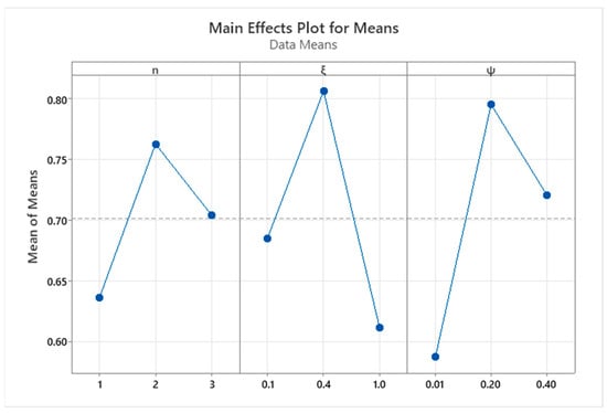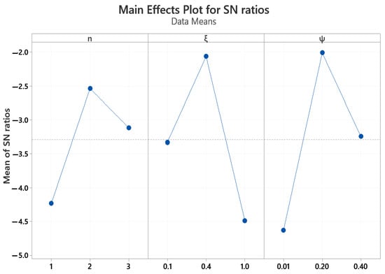 Figure 6 shows the main effects plot for means, where the dotted line denotes the mean of means for all the results (the average of 9 WSM readings). The blue points represent the mean of three results for each parameter level. Figure 7 represents the main effect of signal-to-noise (S/N) ratios against the low, medium, and high (L, M, and H) levels of , , and .