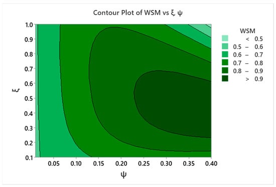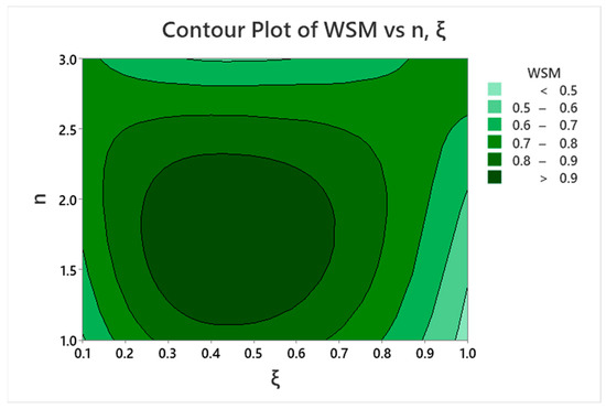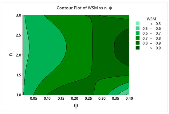 Figure 8, Figure 9 and Figure 10 show the WORKSHEET Contour Plots of WSM vs. and , WSM vs. and , and WSM vs. and respectively. The examination of these figures (Figure 6, Figure 7, Figure 8, Figure 9 and Figure 10) clearly illustrates that the optimal geometrical parameters for the bearing profile are , , and . The effect of these values on the considered characteristics will be illustrated in detail in the following paragraphs.