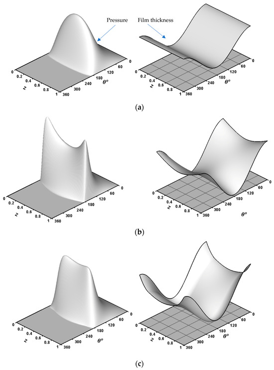 Shape of pressure (left) and film thickness (right) distributions. (a) Ideal case, (b) shaft deviation and (c) optimized profile.