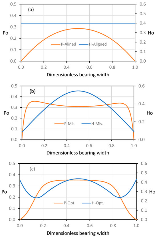 Variations in dimensionless pressure and dimensionless film thickness along the bearing width at . (a) Ideal, (b) misaligned and (c) optimized profile case.