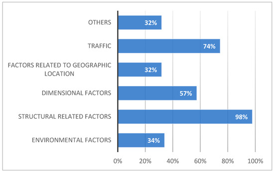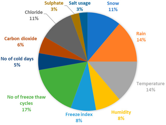 This section discusses the findings regarding the factors that have been adopted in the development of deterioration models for bridges. Figure 1 summarizes the thirty-three factors found in the literature review, and these could be classified into six groups; environmental factors, structural-related factors, dimensional factors, factors related to geographic location, traffic, and other factors. In addition, the structural-, traffic-, and dimensional-related factors are the most included in the development of deterioration models. Figure 2 shows several structural-related factors which were included in different deterioration models. The age of the bridge and the superstructure type are the main factors that were included in the development of DMs. Furthermore, snow, rain, temperature, humidity, freeze index, number of freeze–thaw cycles, number of cold days, carbon dioxide, chloride, sulphate, and salt usage are some of the environmental conditions that are included in DMs, as shown in Figure 3. It is worth noting that the data in Figure 2 and Figure 3 are based on the reviewed references. Therefore, the percentages shown in the two figures represent the percentage of references.