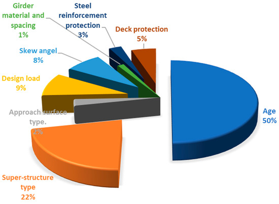 Although some of the states used the same methods and types in developing the deterioration models, different factors were considered in each model, based on the local conditions. Age, average daily traffic (ADT), and average daily truck traffic (ADTT) were found to be the most common factors adopted in the deterioration models developed in North America [8,38,42,43,44,45,46,47,48,49,50,51,52,53,54,55,56,57,58,59,60,61,62].