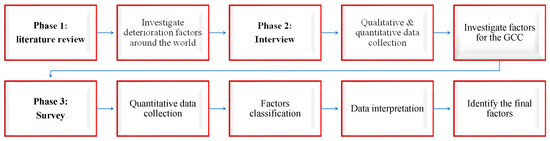 The above-mentioned tasks are conducted in three phases. In the first phase, a comprehensive literature review on the developed deterioration models around the world was conducted. In addition, several factors that were adopted in the models were identified. These factors were classified into six groups; environmental factors, structural-related factors, dimensional factors, factors related to geographic location, traffic, and other factors. With a total of thirty-three factors found in the literature, only twenty-seven factors were considered in this study based on the environmental conditions of the GCC countries.