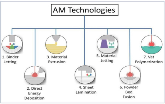 Additive manufacturing (AM) technologies have advanced greatly over the past few decades. In these technologies, products or three-dimensional (3D) parts are developed from their computer-aided-design (CAD) models [1,2,3]. The parts to be printed are built up in a layer-by-layer scheme on a plane designated as the X–Y plane, and the layers are added in the orthogonal Z-direction. 3D printing opens up new possibilities for fabricating complex structures using multiple materials [4,5] and reduces the design–manufacturing cycle, which in turn reduces the production costs and the material wastage. According to the nature of materials and parts development, there are seven different classes of AM techniques (Figure 1). Many parameters affect the quality of the final parts in the AM processes. To manufacture high-quality AM products, a good understanding of the process and material properties is essential. In recent years, the quality control/checking of AM structures has received much attention from manufacturing industries to make sure that the parts developed have the required specific functional properties [6,7,8]. For example, unwanted porosity in AM parts adversely affects their mechanical performance [9,10]. Recent studies have demonstrated the production of high-density parts (>99.8%) with the utilization of improved control systems [11]. The development of new AM materials for manufacturing critical AM structural parts is becoming increasingly important. AM technologies are used in the aerospace [12], automotive [13], medical science [14], and printed electronics [15,16] industries. The application of AM technologies in the biomedical field includes the production of customized prostheses, surgical and assistive tools, implants, instruments, pre-operative surgical planning and disease diagnosis and treatments [17]. Using 3D printing methods, functional tissue can be assembled from cells and scaffold materials. In tissue engineering, a 3D-printed construct would be ideal since it would be able to direct cells to migrate and proliferate, resulting in functional tissue.