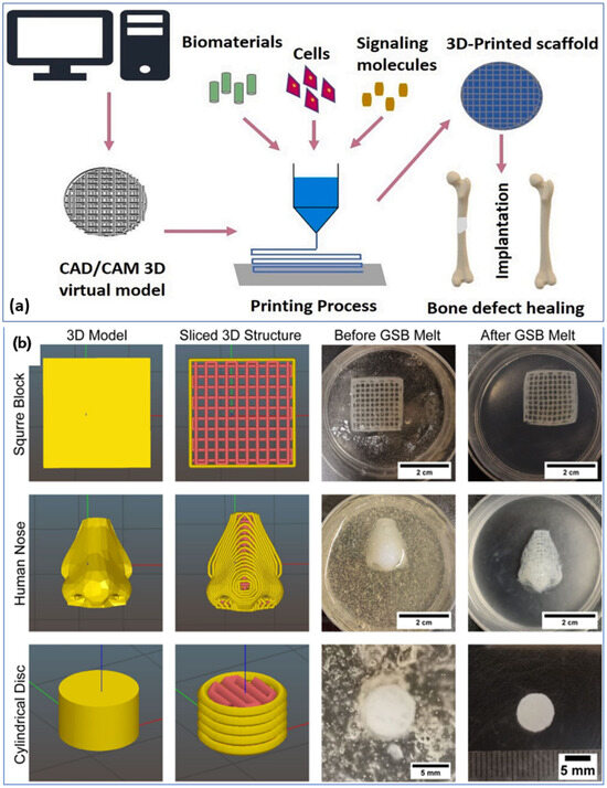 Collagen, a type of natural polymer, is the most common candidate used for tissue engineering, along with corn starch, dextran, proteins, and polysaccharides [65]. Collagen (an insoluble fibrin found in human body tissues)-based 3D-printed scaffolds have been reported in many studies [66,67]. Various methods can be used to develop collagen scaffolds [68]. In 2022, Zhengwei Li et al. reported a technique to produce an in situ mineralized scaffold based on collagen for guided bone regeneration [39]. The mineralization process in this work involved electrospinning mineral ions in a collagen solution. In one of the works, Xiao-Hong Li et al. reported a collagen–silk fibroin-based scaffold implant for nerve-repairing applications [69]. In their study, they focused on two techniques, such as freeze-drying technology and 3D printing, and it was found that rats’ neurological function, based on locomotor performance and electrophysiological analysis, was significantly enhanced by the implant made via the 3D printing method compared to the other implant. One study by Xiaoyi Lan et al. showed a bioprinting technique to develop collagen-based tissue-engineered nasal cartilage (Figure 3b) [70]. For this work, they used human nasoseptal chondrocytes and bovine type I collagen hydrogel for FRESH-inspired bioprinting, and suggested that this is a promising strategy for exploring further for providing autologous nasal cartilages for nasal cartilage reconstructive surgeries. The use of composite materials provides higher mechanical properties to the 3D-printed scaffold. The 3D printing of scaffolds made of bioactive calcium phosphate glass and polylactic acid (PLA) composite was reported in one study. In this case, an extrusion-based 3D printer was used to develop scaffolds with high porosity [71]. The utilization of composites is important in the development of the 3D-printed extracellular matrix of scaffolds. Figure 3a is a schematic of the scaffold 3D printing process [72] and Figure 3b is the bioprinting process based on collagen ink [70]. Table 1 presents some examples of biomedical scaffold materials, methods, and applications.