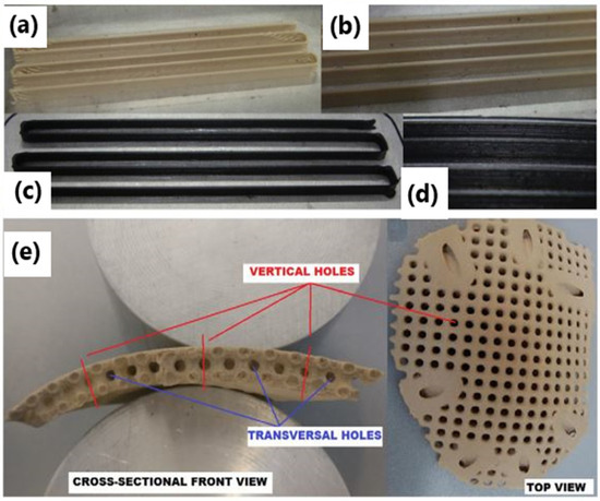 Milling, injection molding, compression molding, forming and sintering are the conventional techniques used to fabricate PEEK composites-based parts; however, precision, the complexity and control of internal geometry, and high processing costs are the limitations of these conventional processing techniques [122,123,124,125,126,127,128,129,130,131]. To overcome the above limitations, 3D printing has been used as a forming process for fabricating PEEK-based components to produce complex shapes, which are beyond the scope of conventional technologies. The AM technique is specifically suited for the manufacturing of biomedical implants based on PEEK and its composites as patient-specific scaffolds that overcome the constraints of traditional manufacturing approaches. Selective Laser Sintering (SLS) and Fused Deposition Modeling (FDM) are widely used 3D printing methods to process PEEK and its composites [132,133,134,135]. The FDM technique, based on filament extrusion, usually uses low-melting-temperature polymers such as acrylonitrile butadiene styrene, thermoplastic polyurethane (TPU) and polylactic acid (PLA). In the work of Berretta et al., the high-temperature printing of a PEEK composite filament made up of 5% and 1% carbon nanotubes (CNTs) with a MendleMax v2.0 FDM system was examined (Figure 4a–d) [132]. According to their findings, the quality of the FDM parts depends on CNT mixing within the PEEK, printing conditions, and filaments used. In another work, the authors laser-sintered the PEEK cranial implant and analyzed its weight, dimensional accuracy, and mechanical properties (Figure 4e) [136]. They investigated the effects of the build direction (e.g., oblique, horizontal, inverted horizontal or vertical orientations) on the properties of the PEEK cranial implant. The studies show that a cranial implant developed in the horizontal direction exhibits higher geometric accuracy and compressive strength than those produced in the vertical direction.