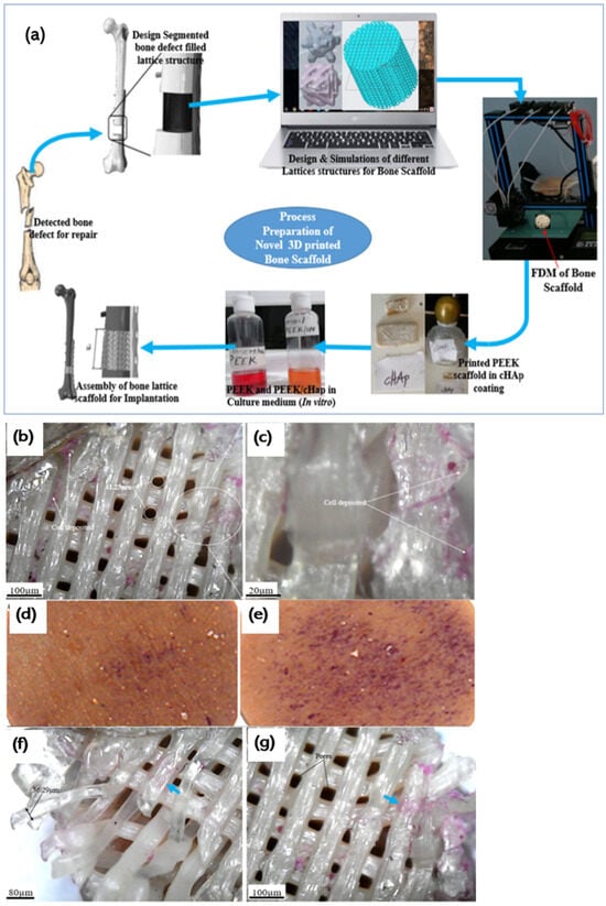 (a) Schematic of PEEK-based bone implant printed using FDM. (b–g) Cell attachment to the surface of the PEEK and PEEK and cHAp scaffold [137]. Copyright © 2020 with permission from Elsevier. (j) SEM micrographs of apatite layer development on the PEEK and PEEK composite surface after keeping them in a simulated body fluid for different days [143]. Copyright © 2021 with permission from Elsevier.