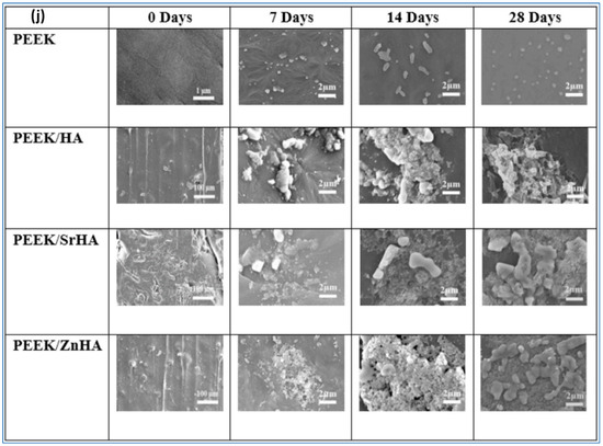 In 2020, Oladapo et al. developed a cHAp/PEEK composite for the FDM-printing of scaffolds (Figure 5a) and studied the effects of cHAp on the PEEK surface [137]. The bioactivity of the developed implants was investigated by immersing them in a simulated body fluid for several days (Figure 5b–g) [137]. They found reduced biocompatibility and osseointegration around PEEK when compared to the PEEK/cHAp composite. The mechanical properties showed an improvement, with 15 wt. % cHAp as the optimum filler loading. The composite shows a better spread, adhesion, proliferation, and greater alkaline phosphatase activity. Furthermore, the osseointegration activity around the composite was higher than that around PEEK. In their study, the PEEK/cHAp composite was found to be more biocompatible and osseointegrable than PEEK. In another work, Faizal Manzoor et al. prepared PEEK-based filaments containing 10 wt. % of pure nanosized HA and PEEK/nano HA doped with Sr as well as Zn through hot-melt extrusion, which were subsequently 3D-printed via FDM [143]. Despite the reduction in crystallization temperature and increase in melting point with the addition of filler into pure PEEK, no noticeable changes in crystallinity were observed. Apart from the small drop in the tensile strength (~14%) and Young’s modulus of approximately 5% in the PEEK/HA in comparison to the pure polymeric phase, the composites showed only slight differences in mechanical properties with the addition of the inorganic phases into the PEEK matrix. Moreover, the formation of apatite was observed on the surfaces of samples containing all the tested fillers, such as nano HA, SrHA and Zn HA. The in vitro bioactivity of 3D-printed samples was evaluated via a simulated body fluid immersion test for up to 28 days (Figure 5j) [143]. Zheng et al. reported the 3D printing of a PEEK/HA composite using a composite filament [144]. The composite filament was prepared through mechanical mixing followed by extrusion with filler loading of up to 30%. The HA phase was uniformly distributed on the surface of the PEEK matrix. A high amount of particle agglomeration was observed at this maximum filler loading. The strength and failure strain decreased with increasing HA content, whereas the modulus increased. The tensile modulus of the composite increased by around 68% when the HA content was increased to 30 wt. %. The tensile strength and elongation were highest for parts printed in the horizontal direction.