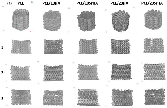 To ensure mechanical suitability for medical implants, Petersmann et al. studied various 3D-printable polymers, such as PLA, PEEK, polypropylene (PP), poly(methyl methacrylate) (PMMA), poly(vinylidene fluoride) (PVDF) and glycol-modified poly(ethylene terephthalate) (PETG), and in the temperature range desired for specific applications [148]. The high strength of PMMA and PEEK makes them suitable for load-bearing components; for example, cranial implants [149,150,151]. However, PP and PVDF show high flexibility, which could make them suitable for the sutural material application [152]. Pierantozzi et al. fabricated scaffolds based on PCL, PCL-HA and PCL-Sr HA using the FDM technique (Figure 6) [153]. Based on micro-CT analysis (Figure 6a), it became evident that the different designs produced showed high fidelity to the CAD model in terms of the porosity values (which were in the range of cancellous bone). Micro-CT and scanning electron microscopy (SEM) together confirm the uniform dispersion of ceramic particles within the PCL matrix, both on the surface and in the interior. These scaffolds also show good biocompatibility and support for cell growth, attachment, and proliferation. Among the studied composites, the SrHA-based scaffold showed high mineralization when compared to the PCL-HA and PCL-based scaffolds. In terms of mechanical properties, mineralization plays a key role. The use of mineralized micro- or nanomaterials in composites will enhance the mechanical properties of biomaterials and mimic the functions of natural bone tissue. Therefore, the authors of this study suggested that SrHA-based composites would be an attractive candidate for the development of bone scaffolds in tissue engineering.