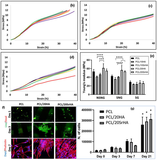 (a) Micro-CT pictures of 3D-printed scaffolds. (b–d) Compressive stress–strain curves of 3D-printed PCL scaffolds (black line), PCL and 10HA (purple line), PCL and 10SrHA (yellow line), PCL and 20HA (green line), and PCL and 20SrHA (red line) and (e) Young’s modulus values (statistics: p < 0.0001 (****), p ¼ 0.0005 (***)). (f) Evaluation of cytocompatibility of 3D-printed scaffolds based on PCL, PCL/20HA and PCL and 20SrHA. (g) Cell number count and standard calibration curve (statistics: p < 0.0001 (*)) [153]. Copyright © 2021 with permission from Elsevier.
