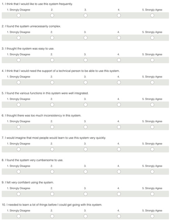 - Sauro, J. 5 Ways to Interpret a SUS Score; Measuringu: Denver, CO, USA, 2018; Available online: https://measuringu.com/interpret-sus-score/ (accessed on 27 August 2021).