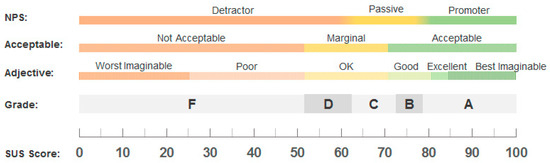 SUS: system usability scale (A—best grade to F—worst grade) [36].