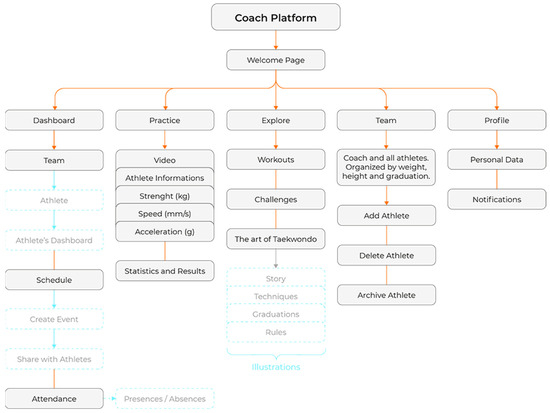 Based on Table 2, the interviews with the coach and athletes and the team meetings, the development of an effective communication corresponding to the individual needs of the users was relevant. Consequently, it became essential to develop two diagrams: for the coach (Figure 4) and for the athlete (Figure 5).