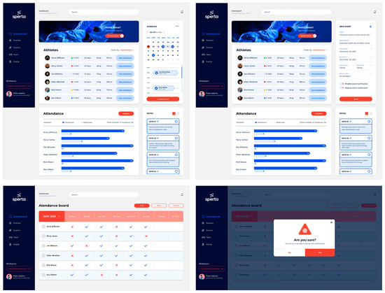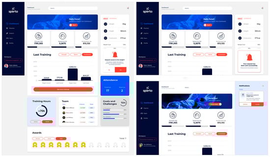 The wireframing process is about defining the structure and flow of potential digital solutions. The purpose of this set of sketches is to organize the project using primary shapes, such as squares and circles. The objective is to understand how obvious the actions for performing a certain task are, or how intuitive a button in an interface is without the application of prominent colours or typography. This process not only reduces the appearance of future errors, but also increases the credibility of the solution [56]. From the identification of the character of the information to the ease in identifying the order and classification of values, the interface should present a good data structuring in a functional and direct way [57], since it is essential for the athlete to have a quick perception of the various information concerning the training. A small detail that makes it difficult to understand any specific value can complicate the whole exercise for the user and influence the athlete’s future performance in the long term.