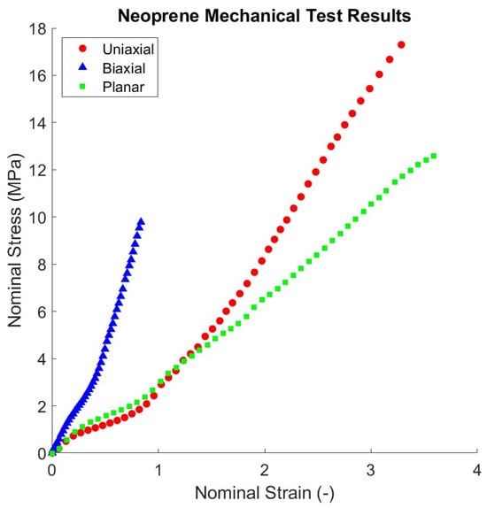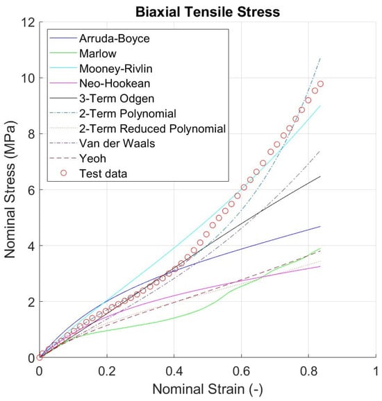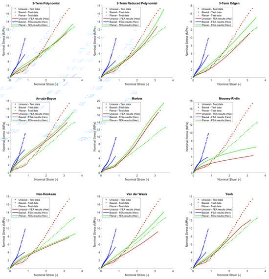 Since there are no data for volumetric strain, a strict incompressible constraint is not enforced in the simulations. Instead, a Poisson’s ratio of approximately 0.475 to ensure efficient software operation has been assumed as suggested by the Abaqus manual. Furthermore, for most load cases, the bulk modulus had limited effect and was thus considered incompressible [1]. The nominal stress–strain curves for uniaxial, equal biaxial, and planar shear tests are illustrated in Figure 2 [20].