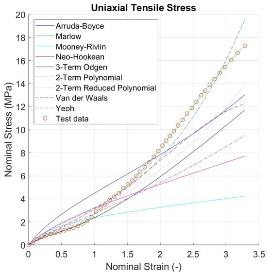 Stress–strain predictions of each model are shown against test data in Figure 3, Figure 4, Figure 5, Figure 6 and Figure 7. The fitting quality of each hyperelastic model were determined using R2 and the values are reported in each corresponding figure. Only two hyperelastic material models, namely two polynomial term and Yeoh, experienced instability.