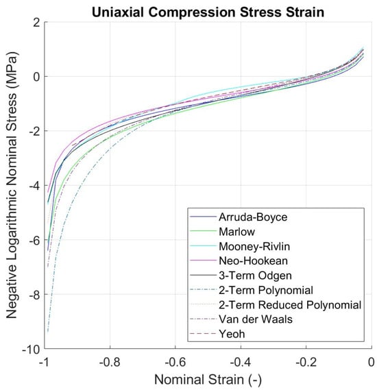 No compression nor volumetric test data were available in the literature used for this study [20]. However, these data are needed to ensure accuracy in the fitting and avoid unstable response when loaded under compression. For this reason, the compressive stress–strain curves were evaluated with negative strain values and Figure 6 and Figure 7 show the uniaxial and biaxial compression stress–strain curve of each model.