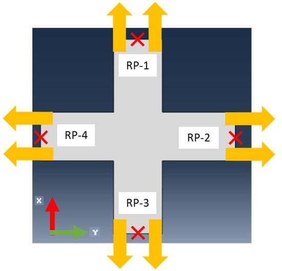 Constraints of the biaxial simulation (orange arrows indicate displacement added).
