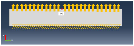 Dog bone specimen for uniaxial tensile testing was modelled together with the cruciform shape for biaxial tensile stress and the uniform cross-section for in-plane shear. The numerical simulations were all implemented in Abaqus CAE and in each simulation, the different hyperelastic models with the corresponding geometry and boundary conditions were used. In physical uniaxial tensile test, the top and bottom rectangular sections are clamped by fixtures. To reproduce that in the numerical simulation, as shown in Figure 8, the top rectangular section was constrained in all directions, and bottom constrained as well, except in the Y-direction which allows movement. Reference Point 1 (RP-1) (see Figure 8) was coupled with the bottom surface of the bottom section, where displacement was applied, which will then move the whole bottom section down. Figure 9 demonstrates the numerical setup of the equal biaxial tensile simulation. The rectangular 30 mm × 10 mm sections at each end are constrained except in the traveling direction to reproduce clamping; thus, the central square section will be equally deformed in X-Y directions. Reference points were coupled with the cross-section of each rectangular section. Displacement in X and Y directions were added to these reference points to apply tensile load; the magnitude of displacement was identical in all directions. For planar shear simulation, similar to the uniaxial tensile simulation, the top and bottom of the 10 mm × 300 mm rectangular section shown in Figure 10 are constrained to reproduce fixture clamping. The 30 mm × 300 mm section, where deformation takes place, has a length ten times greater than its width as recommended by the literature. This aspect ratio allows thinning of the centre section with tensile load; thus, planar shear exists 45 degrees to the stretching direction [20].