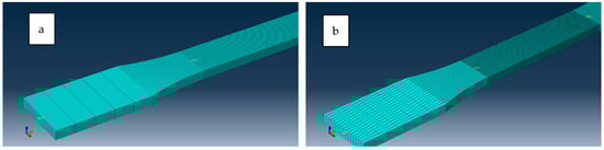 In plane shear specimen meshed with hexagonal element (a) and tetrahedral (b).