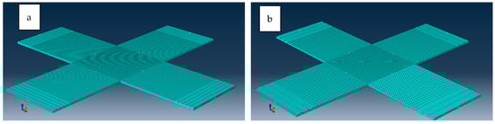 Cruciform specimen meshed by hexagonal element (a) and tetrahedral (b).