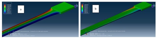 The results are grouped in Figure 14 and Figure 15 to show uniaxial tensile stress, where the Marlow model has a R2 equal to 0.999 in uniaxial tension for both tetrahedral and hexagonal elements, suggesting that these models can replicate the material behaviour under pure tensile load independently of the element formulation. The two-terms polynomial material model has a lower R2 (FEA compared with experiment) because it experiences instability when the strain value exceeds two and the stress strain curve diverged from its model prediction results (see Figure 14 and Figure 15). The contour plot illustrating longitudinal displacement in Figure 16a, corresponding to the dog bone specimen model using the two-terms polynomial material model, remains stable across the strain range under consideration and exhibits necking in the central section. As the strain range reaches the unstable range (see Figure 16b), the central section experiences an unrealistic deformation (it becomes larger) which indicates instability. The Yeoh model also showed instability, but the numerical results of the uniaxial tension load condition did not show any visible distortion at high strain. This could be explained with the strain considered in this study being within the stable range for this material model.