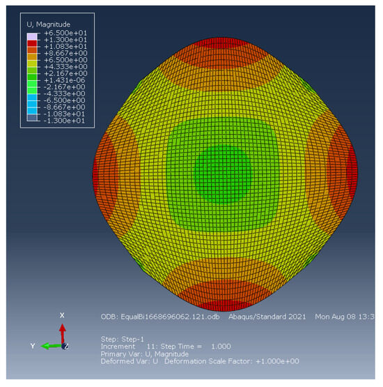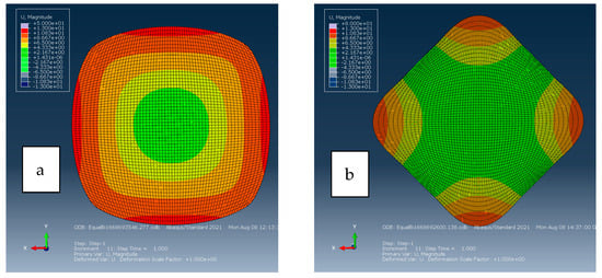 The deformations of the central section when applying different hyperelastic models are shown in Figure 17 and Figure 18. The displacement contour shown in Figure 18a, using the Arruda–Boyce model, shows a more uniform deformation unlike that of Mooney–Rivlin and van der Waals models (Figure 19). The non-uniform deformation of the central section was the reason why the biaxial stress calculated from simulation was diverging from model predictions, explaining why these two models were not accurate in biaxial simulation. In addition, arms of the cruciform specimen are affecting the load transfer to the central section due to the excessive deformation experienced by the arms instead of the central section [21]. Hyperelastic models which depend on the second deviatoric invariant have more unwanted deformation compared to models which only depend on the first deviatoric invariant. This suggests that for biaxial simulations like those performed in this study, the shape of the specimen should be manipulated to evaluate the biaxial accuracy of the hyperelastic models.