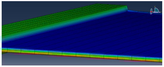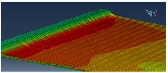 Tetrahedral elements in planar shear simulation provided a close match to hexagonal elements. However, most simulations using tetrahedral elements except van der Waals and Mooney–Rivlin models did not converge in the same strain range as hexagonal elements. Comparing the deformation of the tetrahedral and hexagonal meshes shown in Figure 20 and Figure 21, an asymmetric response is observed for the tetrahedral mesh due to the asymmetric reduction in thickness. The asymmetric reduction in thickness makes the simulation converge at higher shear strain challenging. This also suggested that tetrahedral elements used to model planar shear deformation would produce unrealistic results. The hexahedral elements produced, instead, symmetric deformation and did not show any issue with convergence during simulation.
