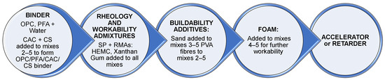 Calcium aluminate cement (CAC) is an option for reducing open times and promoting hydration, but presents two challenges. Firstly, for AM applications, material must be able to flow through a miniature deposition system prior to accelerated exothermic CAC hydration reactions with a rapid rate of heat evolution [31,32] taking place following deposition. RMAs can be used to influence the rheology of fresh material mixes [33] and pseudoplastic RMAs such as hydroxyethyl methyl cellulose (HEMC) can possess retardation properties [34]. However, combining CAC with OPC promotes early ettringite formation and a flash-set [35]. Hydration times are directly affected by variations in quantities of OPC and CAC [36] and environmental temperature [37], with high temperatures promoting rapid hydration [38]. Therefore, acceleration (at low environmental temperatures) and retardation (at high temperatures) may need to be considered in OPC/PFA/CAC/CS binder-based mix formulations.