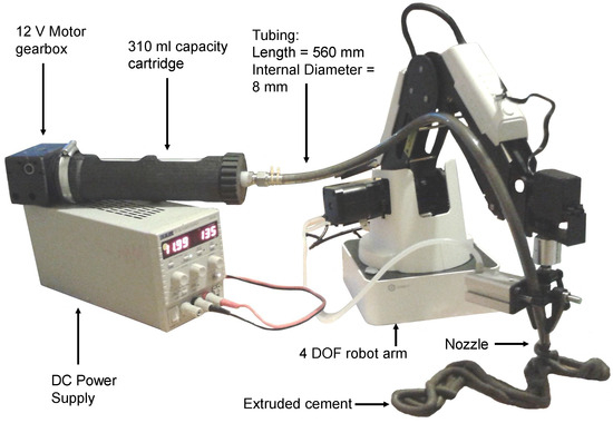 The AAM project miniature deposition device [22] with a 12 V DC motor suitable for UAV carriage is shown in Figure 2. Material is pushed through the cartridge by a plunger attached to a threaded rod. The device component, which determined mix formulation to the greatest extent, was the 560 mm length of flexible plastic tubing connecting the tip of the material cartridge to the 8 mm diameter nozzle. In Figure 2, the nozzle is depicted as being held and directed by a four degrees of freedom (DOF) Dobot magician robotic arm (Dobot, Shenzhen, China), representing the role performed by a stabilising delta arm robot, which attaches to the base of a UAV to guide, and provides lateral stability to the nozzle [22]. During the extrusion experiments carried out in this study, nozzle movement was also controlled by hand.