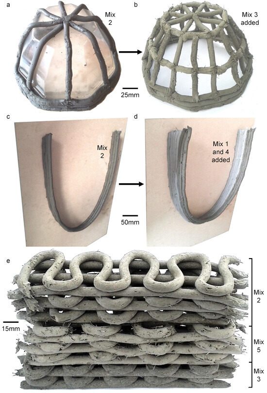 Printed by hand, Figure 3a shows a latticed dome structure consisting of mixes 2 and 3 printed upon supporting material, which was subsequently removed to prove the structure to be self-supporting (Figure 3b). A U-shaped 8-layered extrusion featuring mixes 1, 2 and 4 was deposited on a vertical surface (Figure 3c,d). Three layers of fresh material can be printed vertically in immediate succession during the open time of the material. The fourth and subsequent layers must take place after the material has hardened—Figure 3d shows three fresh layers extruded upon hardened previous layers.