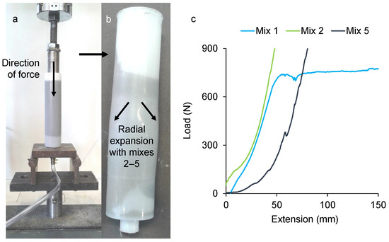 Force required to extrude material: (a) A restrained cartridge subjected to force upon the plunger. (b) Ensuing radial expansion of the cartridge due to exothermic hydration of mixes 2–5. (c) Force required curve showing the plateau of the successfully extruded mix 1 (without CAC and CS) and examples of the CAC mixes 2 and 5 which caused radial cartridge expansion and failed to extrude material.