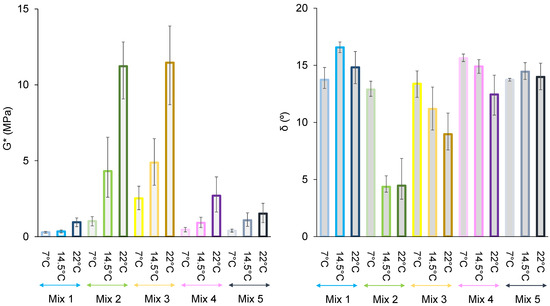 Oscillation complex modulus G* and phase angle test results for mixes 1–5 over the period of 15–25 min following mixing. Tests were conducted at 7 °C, 14.5 °C and 22 °C. Error bars denote maximum and minimum values recorded within the time frame. For the three temperatures presented, mix colours are further defined from light-dark, for example mix 3 is lighter yellow (7 °C), medium yellow (14.5 °C) and darker yellow (22 °C).