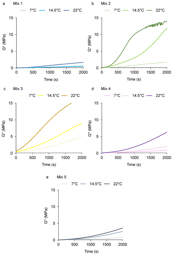 Oscillation complex modulus G* profiles for mixes 1–5 over the period of 2000 s following mixing. Tests were conducted at 7 °C, 14.5 °C and 22 °C. For the three temperatures presented, mix colours are further defined from light-dark, for example mix 3 is lighter yellow (7 °C), medium yellow (14.5 °C) and darker yellow (22 °C).