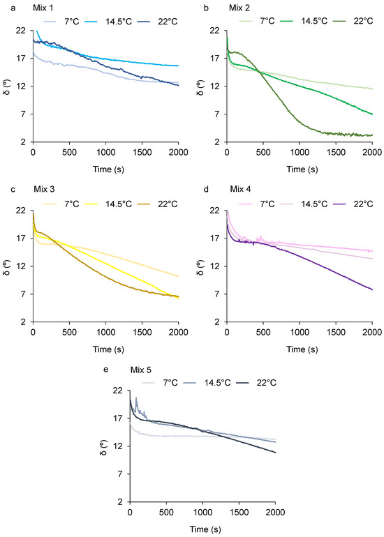 Phase angle profiles for mixes 1–5 over the period of 2000 s following mixing. Tests were conducted at 7 °C, 14.5 °C and 22 °C. For the three temperatures presented, mix colours are further defined from light-dark, for example mix 3 is lighter yellow (7 °C), medium yellow (14.5 °C) and darker yellow (22 °C).