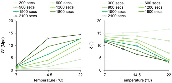 Mix 2 complex modulus G* and phase angle changing with temperature over the open time period. Colour shading denotes time difference.