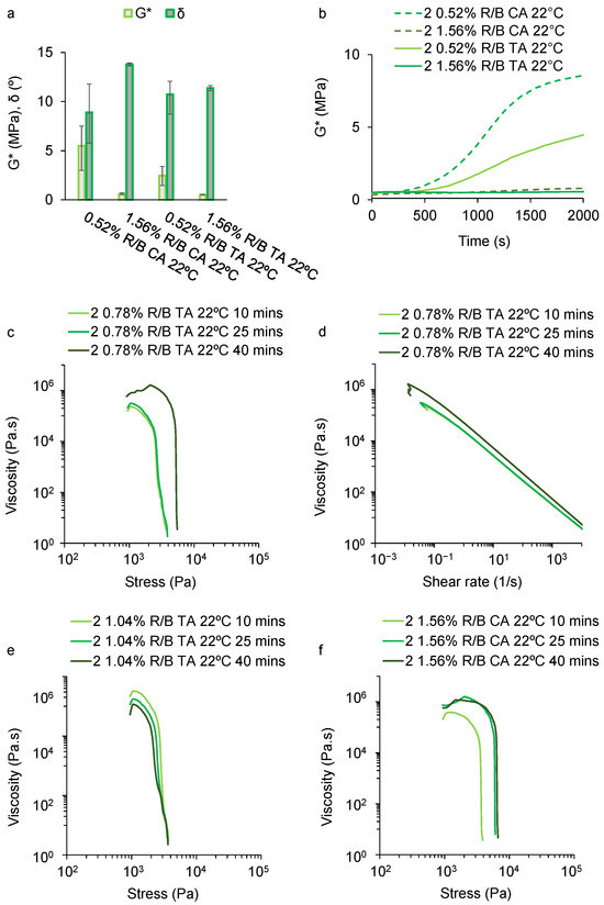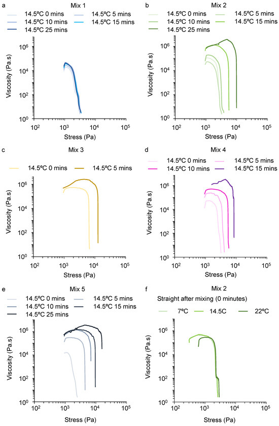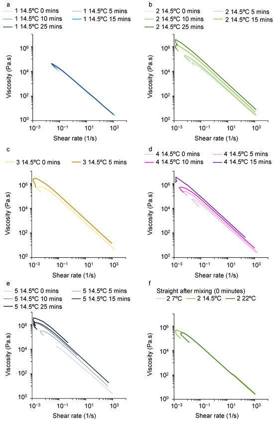 Open time viscosity flow profiles for mixes 1–5. (a–e) rheometer plates kept constant at 14.5 °C, colour shading denotes time differences. (f) Mix 2 tested at different temperatures following mixing, colour shading denotes temperature differences.