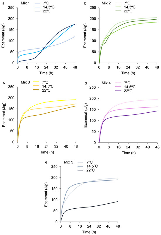 Calorimetry tests: cumulative energy transferred (Ecemmat) during the first 48 h for mixes 1–5 at 7 °C, 14.5 °C and 22 °C. For the three temperatures presented, mix colours are further defined from light-dark, for example mix 3 is lighter yellow (7 °C), medium yellow (14.5 °C) and darker yellow (22 °C).