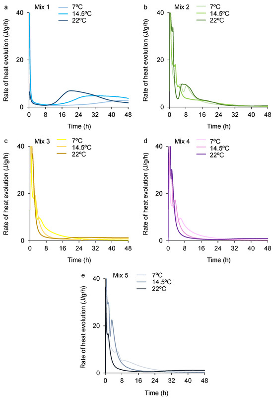 Calorimetry tests: rate of heat evolution during the first 48 h for mixes 1–5 at 7 °C, 14.5 °C and 22 °C. For the three temperatures presented, mix colours are further defined from light-dark, for example mix 3 is lighter yellow (7 °C), medium yellow (14.5 °C) and darker yellow (22 °C).